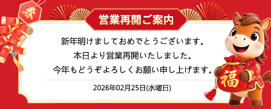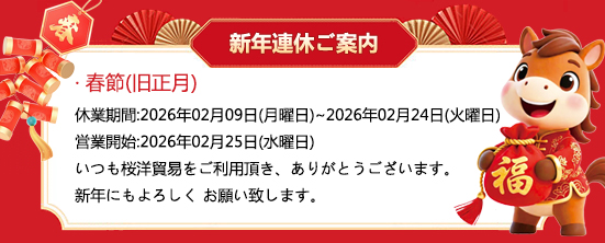 平日 : (中国時間09:00~17:30) (日本時間10:00~18:30) ●土日は休業いたします。 ●中国の祝祭日カレンダー